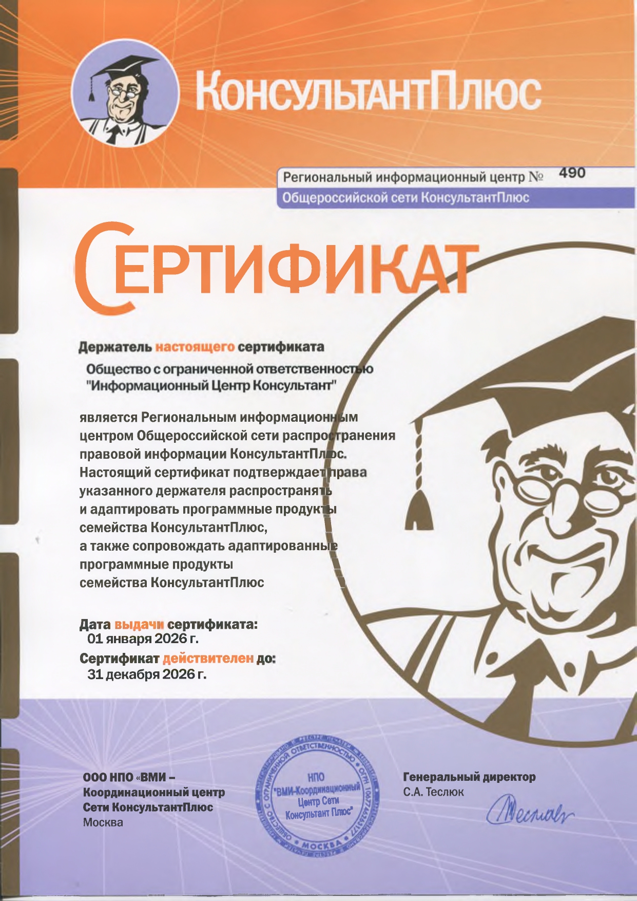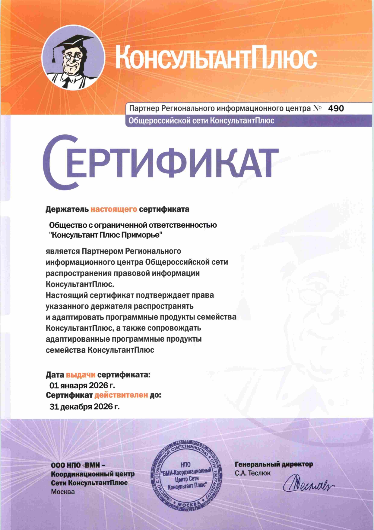 Настоящий сайт является официальным сайтом Регионального информационного центра общероссийской сети Консультант Плюс (РИЦ 490) - Общества с ограниченной ответственностью «Консультант Плюс Приморье», а так же нашего партнёра, Общества с ограниченной ответственностью «Информационный Центр Консультант»